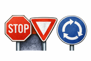 Ces deux panneaux doivent se trouver à chaque entrée du rond-point. Ils sont souvent accompagnés de triangles au sol montrant le céder le passage.