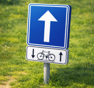 Le petit panneau blanc avec un vélo et une flèche de part et d’autre annonce un sens unique limité. Donc que les cyclos peuvent y circuler dans les 2 sens.